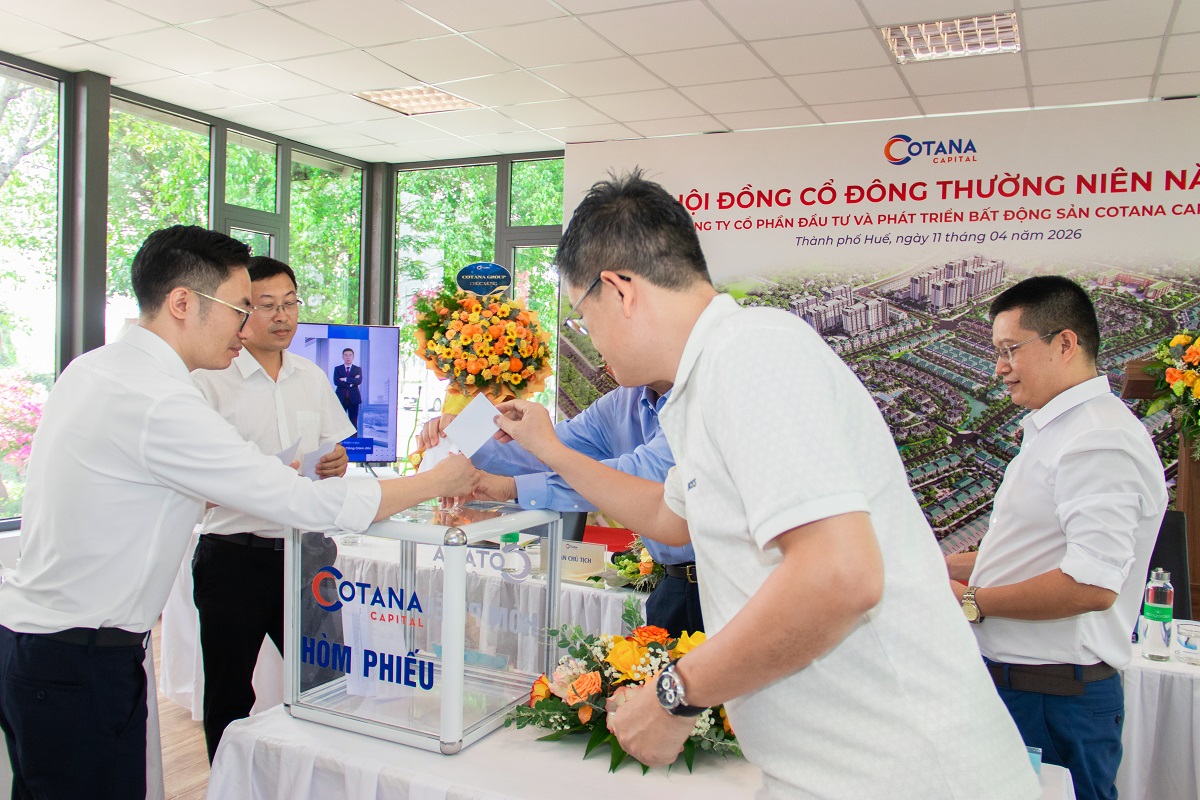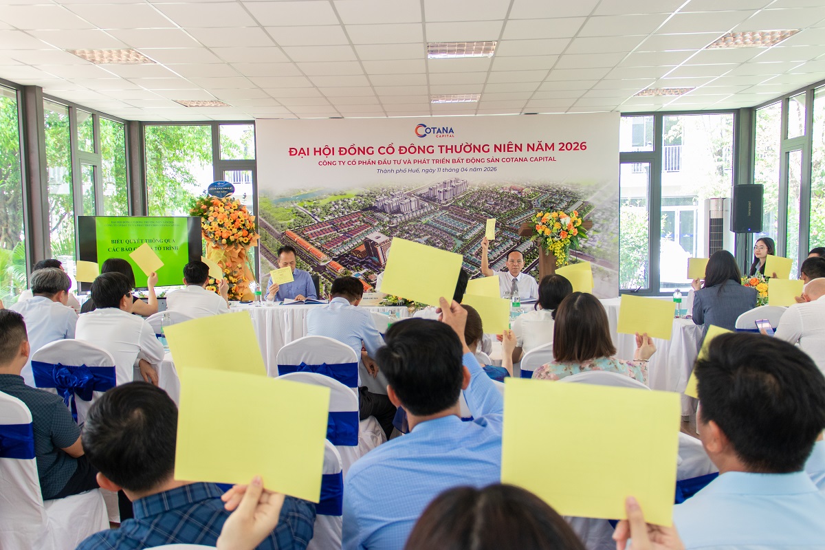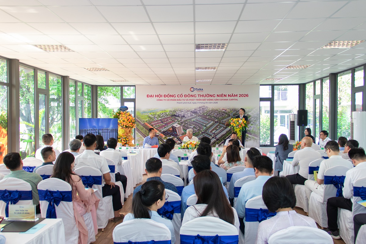 Sáng 11/4/2026, tại phân khu Dahlia, Khu đô thị Ecogarden (TP Huế), Công ty Cổ phần Đầu tư và Phát triển Bất động sản Cotana Capital (Cotana Capital) đã tổ chức Đại hội đồng cổ đông thường niên năm 2026 với sự tham dự của Chủ tịch HĐQT Đào Ngọc Thanh, các thành viên Hội đồng Quản trị, Ban Tổng Giám đốc, khách mời, đối tác và đông đảo cổ đông.