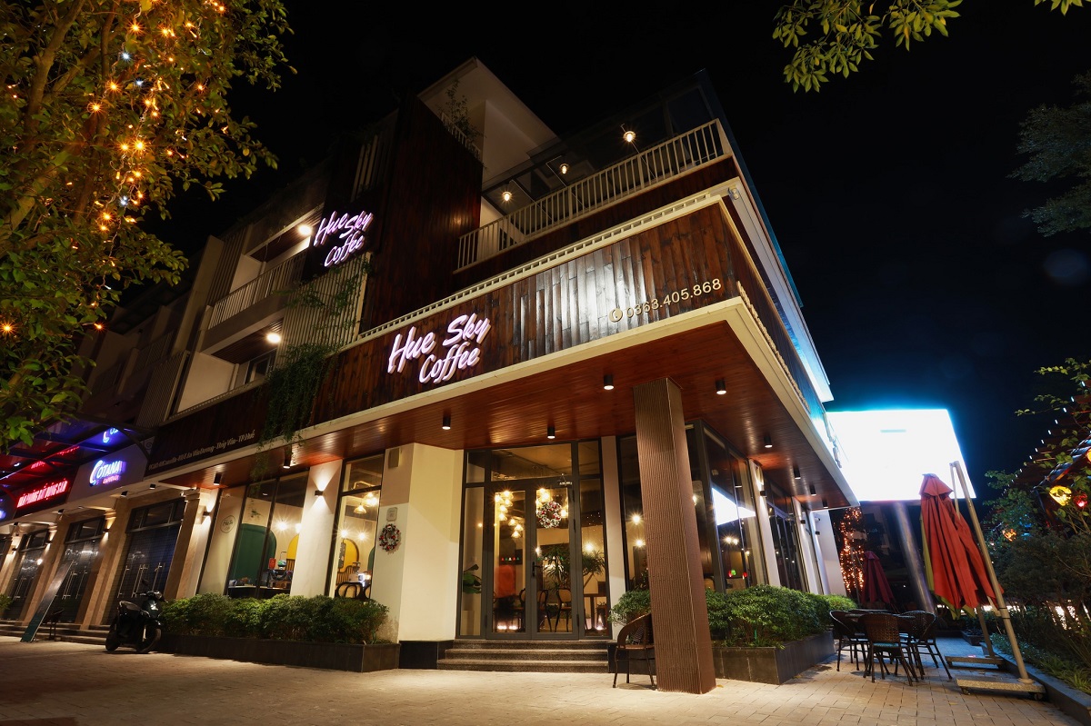Càng về đêm, ánh sáng từ đèn trang trí rực rỡ khắp quảng trường, cầu cảnh quan tại khu biệt thự đảo và Hue Sky Coffee
