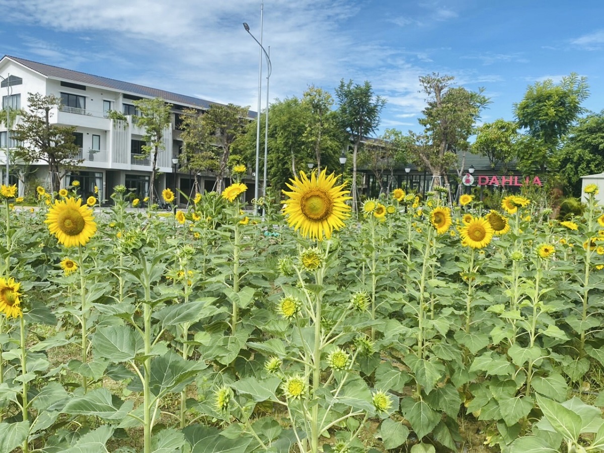 Vàng rực một góc khu đô thị Ecogarden là vườn hoa hướng dương đang vươn mình đón ánh nắng ấm áp của những ngày thu xứ Huế.