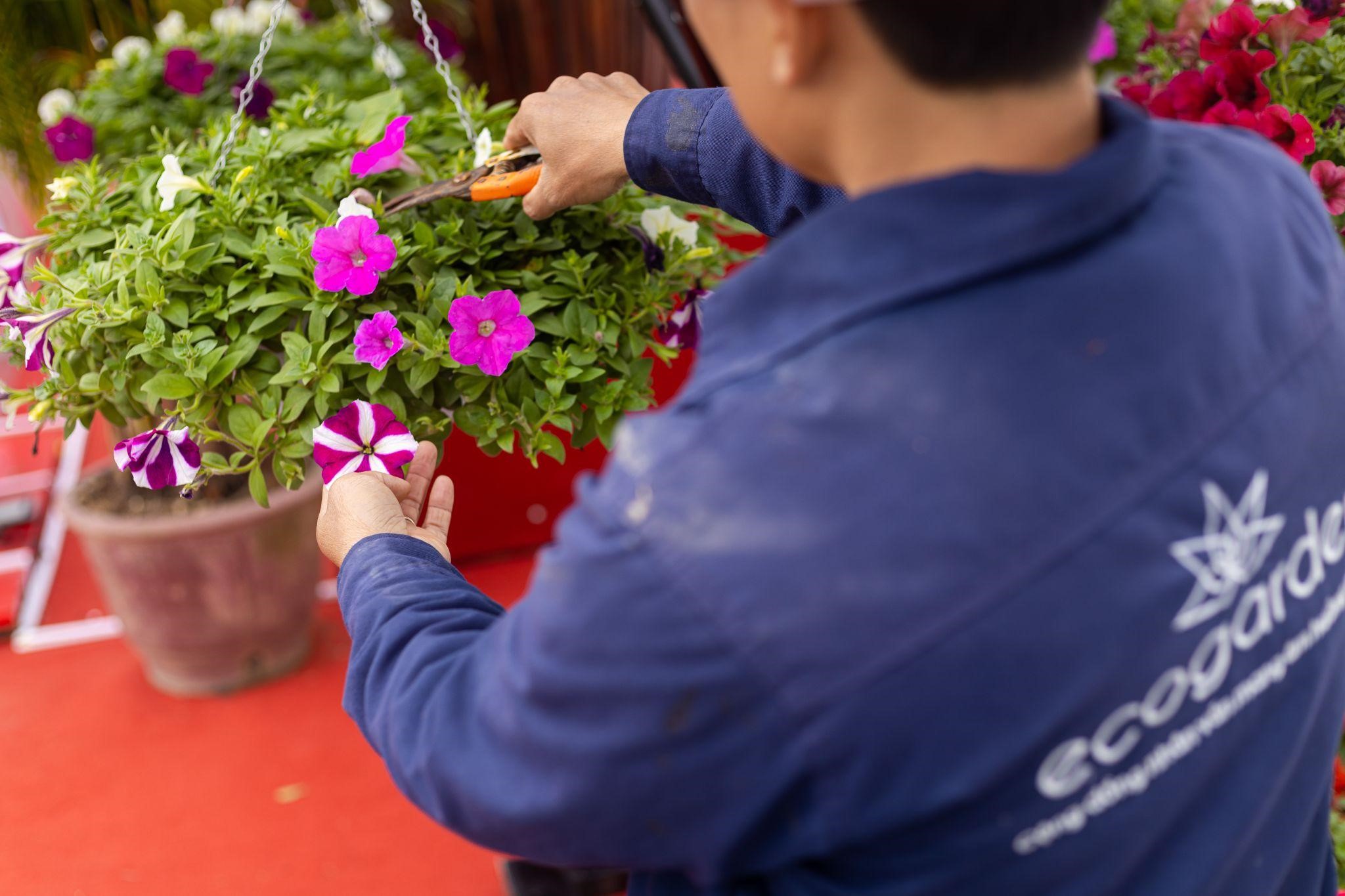 Đôi bàn tay thoăn thoắt của những cô chú công nhân cây xanh cắt tỉa, nhặt nhạnh từng chiếc lá khô, héo úa để cây luôn xanh tốt, hoa luôn tươi tắn.