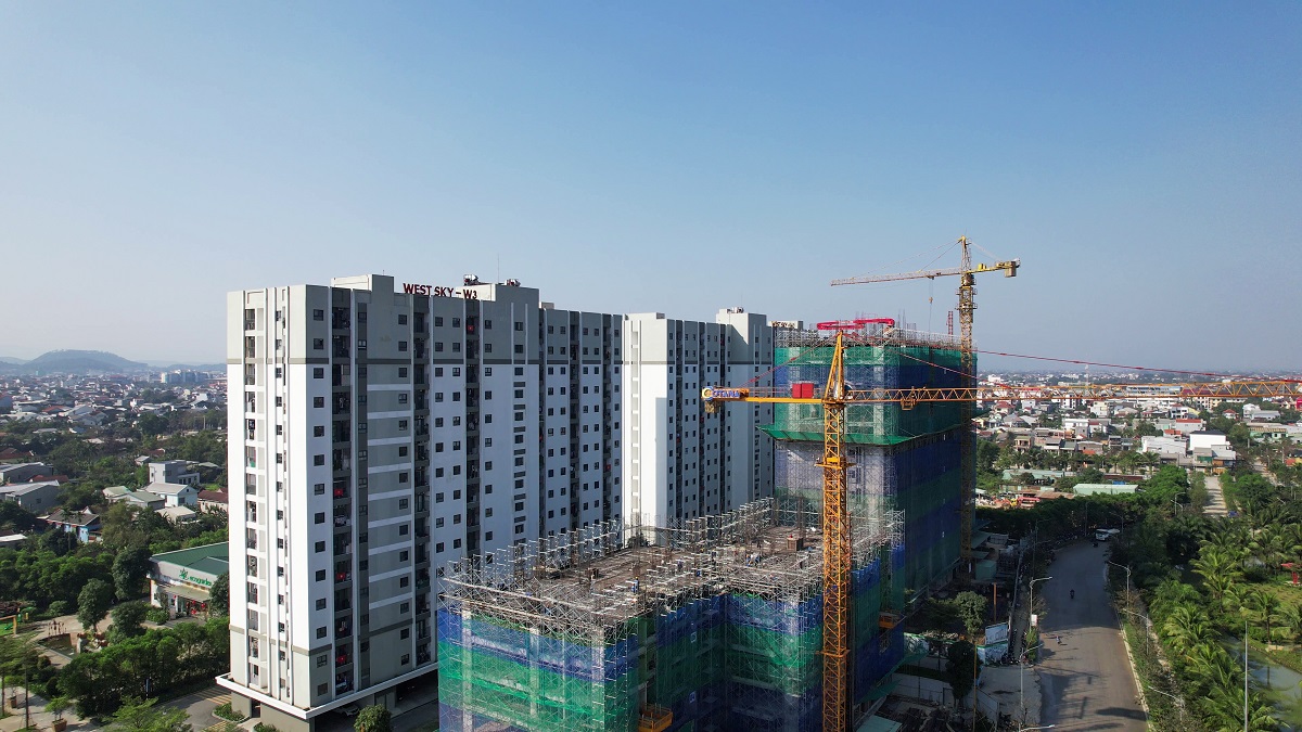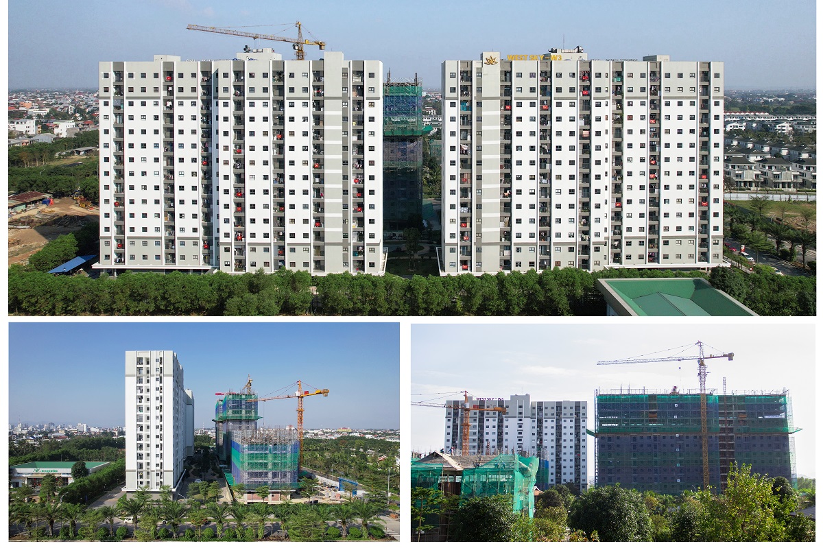 Đối với chung cư West Sky, nhịp sống đã hiện hữu rõ nét và đông vui tại hai tòa chung cư W2 và W3. Trong khi đó, hai tòa W1 và W4 đang được tập trung nguồn lực để đẩy nhanh tiến độ thi công, hướng đến mục tiêu bàn giao trong năm 2026. Cụ thể, tòa W1 đang chuẩn bị cất nóc vào ngày 07/02/2026. Tòa W4 đang triển khai thi công ván khuôn tầng 8, bảo đảm tiến độ theo kế hoạch đề ra.